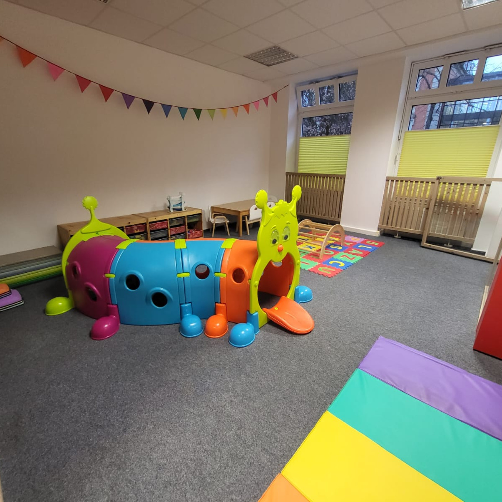 Die Räume unserer Kindertagespflege bieten den Kindern viel Platz zum Toben, Spielen und Schlafen. Es stehen drei liebevoll eingerichtete Räume mit einer Fläche von insgesamt 120 Quadratmetern für vielfältige Entdeckungen bereit. Die Kindertagespflege findet in angemieteten Räumen statt. Die Einrichtung ist modern und mit der kindgerechten Ausstattung fühlen wir uns hier jeden Tag wohl. Sicherheit ist beim Spielen wichtig und so sind die Räume mit verschiedenen Features ausgestattet, die unbekümmertes Spielen ermöglichen.
